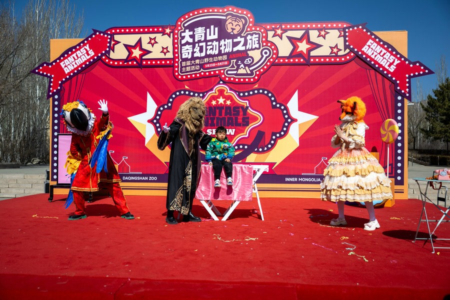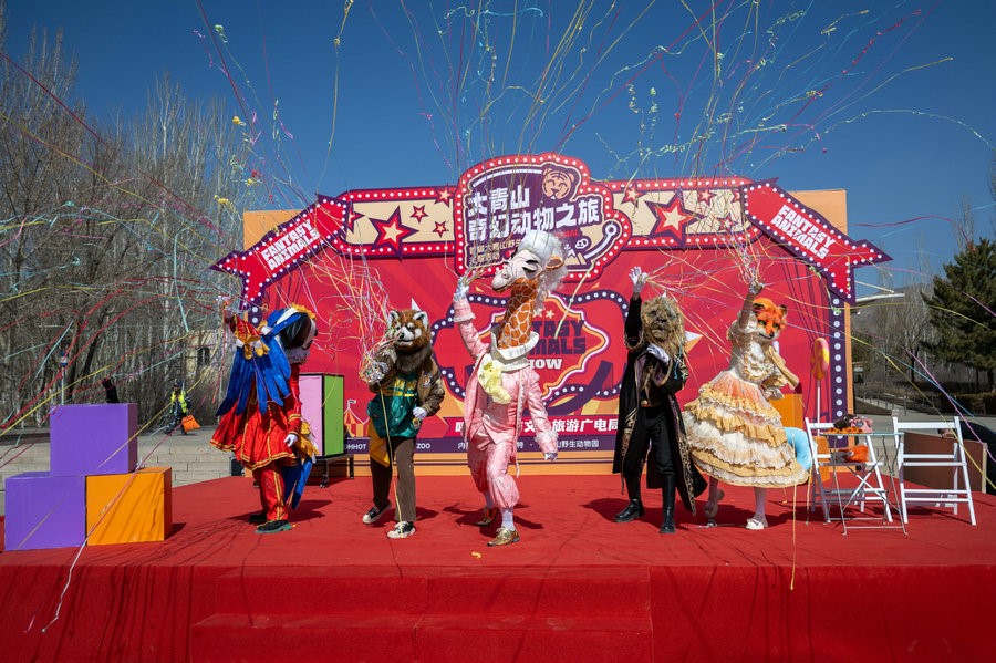 3月22日上午,在內(nèi)蒙古呼和浩特大青山野生動物園里,5只動物人偶正在為23日舉行的國內(nèi)大型動物主題互動巡游偶劇《奇幻動物城》彩排。