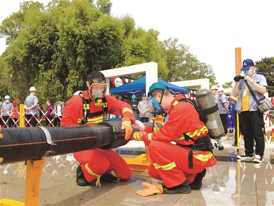 陣陣白煙模擬的是道路中壓燃氣管道泄漏,接到報警后,119消防指揮中心第一時間通過應急聯(lián)絡系統(tǒng)通知住建部門和燃氣企業(yè)到場處置,同時消防救援力量到達現(xiàn)場對泄漏點進行處置。接到通知后,中浩燃氣公司搶修及應急處置人員到達現(xiàn)場,對泄漏區(qū)域20米范圍內(nèi)進行圍擋警戒,并攜帶可燃氣體檢測儀對周邊環(huán)境進行檢測,以防人員受傷,保證作業(yè)安全。應急處置人員佩戴空氣呼吸器進入現(xiàn)場,確定漏點及管道尺寸,用膠帶對漏點進行臨時處理,加裝管道抱卡,臨時封堵管道。現(xiàn)場指揮人員根據(jù)處置情況,集結(jié)隊伍,利用運行不停輸維修設(shè)備進行管道維修。這一連串的操作下來,泄漏點被及時修好。負責此次演練的內(nèi)蒙古中浩燃氣有限公司總經(jīng)理賈鵬程介紹,這套不停輸管道維修設(shè)備,既節(jié)約了成本,又能保證安全供氣,能更好地服務保障廣大市民群眾。
