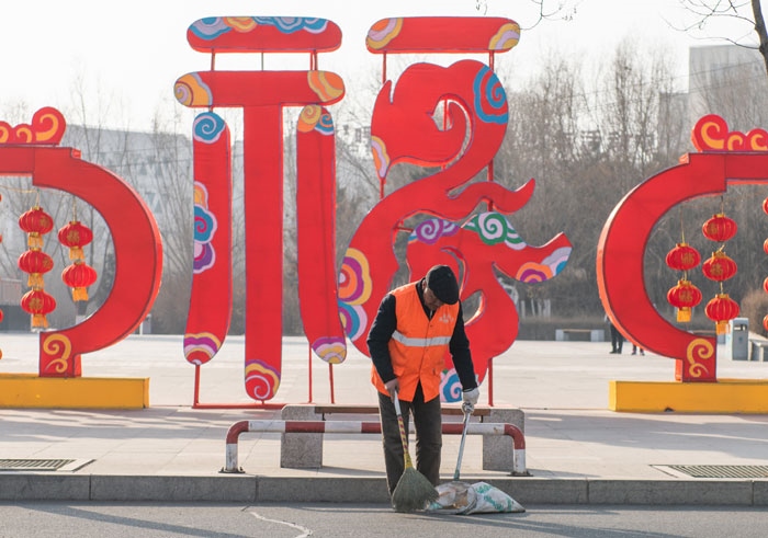 2月5日,正月初一,環(huán)衛(wèi)工人正在清掃街道。春節(jié)期間,呼和浩特市環(huán)衛(wèi)部門在全市特殊區(qū)域、重點路段、公共廁所等公共設(shè)施重點部位,加大環(huán)衛(wèi)力量投入,讓節(jié)日里的市容市貌更加亮麗。