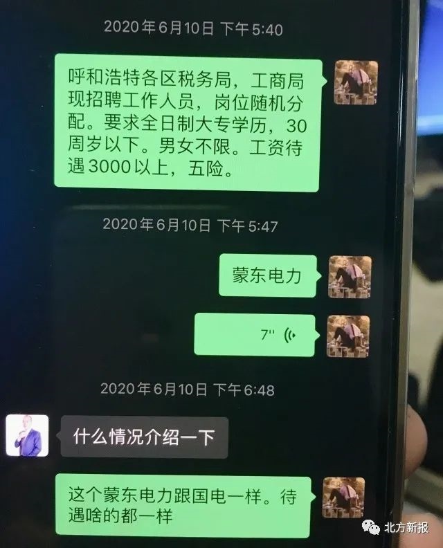 “呼和浩特各區(qū)消防大隊(duì)招聘辦公室內(nèi)勤人員,工資待遇3500元左右?!薄案咚俳痪羰兄ш?duì)(一支隊(duì))輔警,工資和五險(xiǎn)一金,4200元?!薄昂艉秃铺馗鲄^(qū)稅務(wù)局、工商局現(xiàn)招聘工作人員,崗位隨機(jī)分配?!薄昂艉秃铺貗D幼保健院招聘護(hù)士,大專(zhuān)學(xué)歷”……記者在民警繳獲的程某某的手機(jī)上看到,6月8日以來(lái),程某某和趙某某的聊天記錄中,發(fā)送了多條諸如此類(lèi)的招聘信息。
