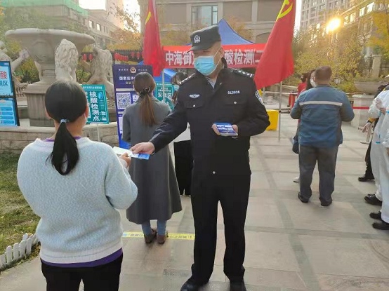按照樓號的不同,中海物業(yè)的工作人員將居民分成了三隊,分別在西門設置了三個檢測站。巧報派出所民警岳軍就站在三個檢測站中間的空地上,手里拿著一沓防電信詐騙宣傳材料,默默地注視著排隊的人群。