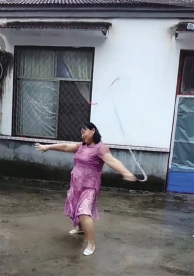 “清水河”大媽與抖音的相遇是在3年前。當(dāng)時(shí),遭遇了親人離世的她悲傷難抑,為了讓她分散注意力,她的女兒幫她下載了抖音。此后,大媽時(shí)常刷刷抖音,也慢慢從中悟出了一個(gè)道理,就是生活中不如意十之八九,人要好好活著,要快樂(lè)地活著。很快,大媽就從悲傷中走了出來(lái),也學(xué)著在抖音上拍攝自己的日常。雖然起初視頻點(diǎn)贊量不多,但能記錄下生活的點(diǎn)滴足以讓她格外開(kāi)心。一直到了去年9月份,大媽無(wú)意之中發(fā)布了一條雨中甩鞭子的視頻。視頻中,大媽身著一襲紅裙,有節(jié)奏地甩起了十幾斤重的鐵制麒麟鞭?!芭距⑴距?、啪嗒……”聲聲響亮、威風(fēng)凜凜。就是這條視頻讓她一夜爆紅。此后短短幾天,這條視頻的點(diǎn)贊量就突破了200萬(wàn),一時(shí)間,抖音上還掀起了一陣和大媽合拍的熱潮。