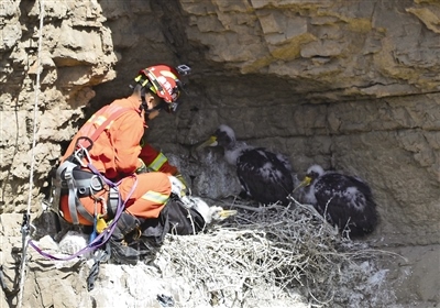 當(dāng)天7時左右,在烏海市海勃灣區(qū)甘德爾山景區(qū)半山腰處,攝影愛好者焦長青在拍攝時發(fā)現(xiàn)了一窩出生20多天的幼年野生黑鸛,其中一只黑鸛行動異常,疑似受傷。他立即撥打了119報警電話,同時聯(lián)系了烏海市野生動物保護(hù)部門。9時許,烏海市消防支援支隊光明路特勤站和烏海市野生動物保護(hù)部門的工作人員到達(dá)現(xiàn)場。經(jīng)勘查,在距離懸崖正下方大約30米處的巖洞內(nèi),一只幼年黑鸛被尼龍繩纏繞住腿部而受傷,不能行動。消防員隨后尋找合適的位置制作錨點(diǎn)。消防員陳意攜帶救援裝備速降到懸崖下方展開營救,一個小時之后,受傷的幼年黑鸛被成功救出,并送往海勃灣區(qū)林業(yè)草原局救助站進(jìn)行救治。