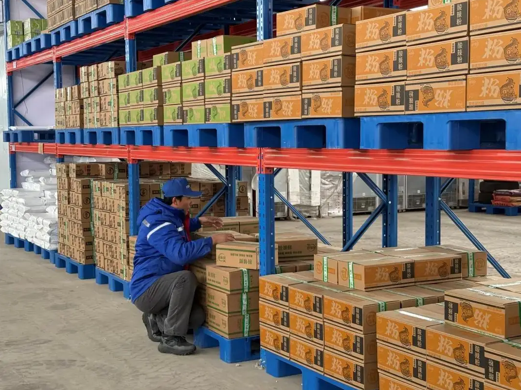 這座占地3000平方米的現(xiàn)代化物流樞紐功能齊全:保鮮冷藏區(qū)保障牛羊肉和乳制品的新鮮口感;常溫倉儲區(qū)整齊碼放著大米、沙果干等特產(chǎn);打包區(qū)里工人配合膜包機(jī)完成高效分裝。更重要的是,政府持續(xù)給予租金補貼,大大減輕了企業(yè)的倉儲負(fù)擔(dān)。