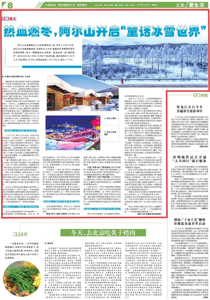 2025年12月2日,《中國婦女報》第8版刊發(fā)題為《熱血燃冬,阿爾山開啟“童話冰雪世界”》的新聞,報道了阿爾山,這座地處內(nèi)蒙古自治區(qū)興安盟的東北小城,近年來憑借獨特的地理優(yōu)勢、豐富的旅游資源和當(dāng)?shù)卣穆貌块T精心推出的“寵客”政策,吸引了國內(nèi)外大批游客,成為冬季體驗冰雪快樂的打卡地。
