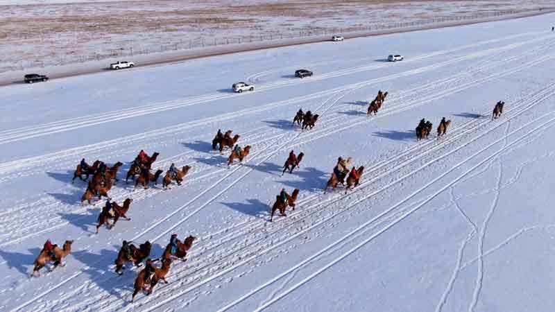 在冰雪覆蓋的草原上,成年駱駝10公里比賽、駱駝選美及128名青壯年搏克賽、射箭比賽等10余項賽事逐一上演,扮靚了寂靜的冬日草原。
