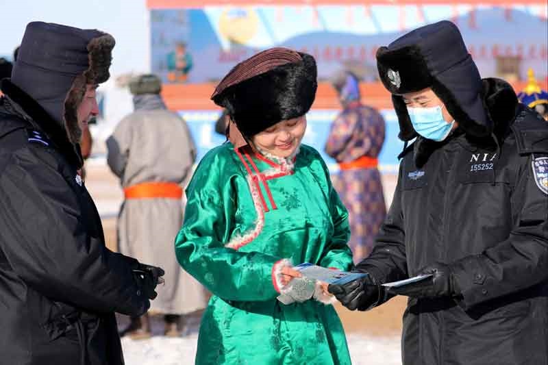 錫林郭勒邊境管理支隊達來、洪格爾、巴音都蘭等3 個邊境派出所共派出20多名警力,對于前來參加那達慕的人們進行嚴格檢查,并向牧民群眾講解當前面臨的新冠肺炎疫情防控形勢,發(fā)放宣傳冊。(內蒙古日報記者 巴依斯古楞 攝影報道)