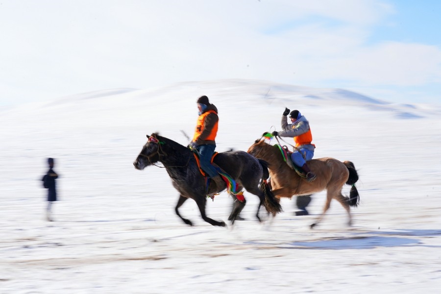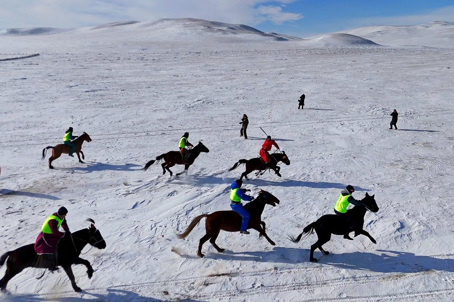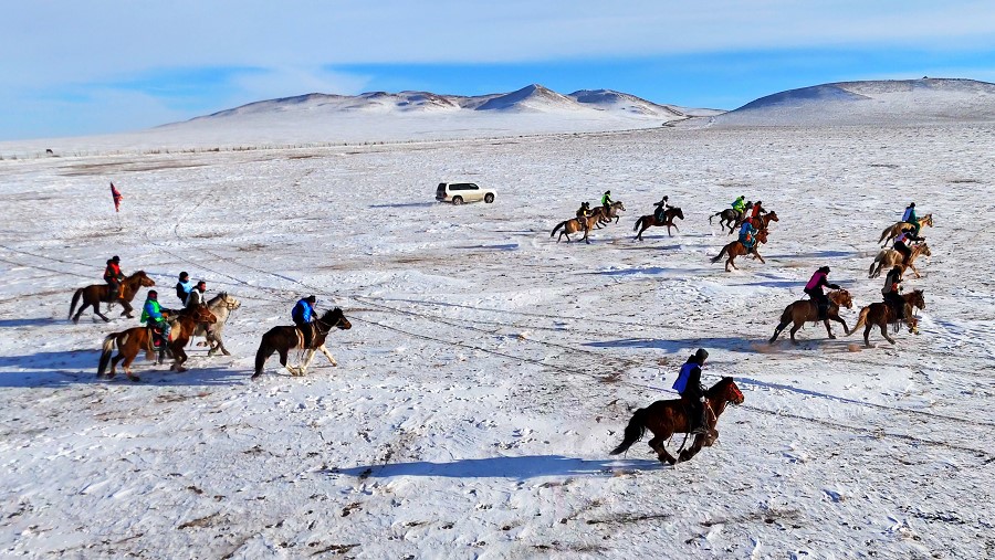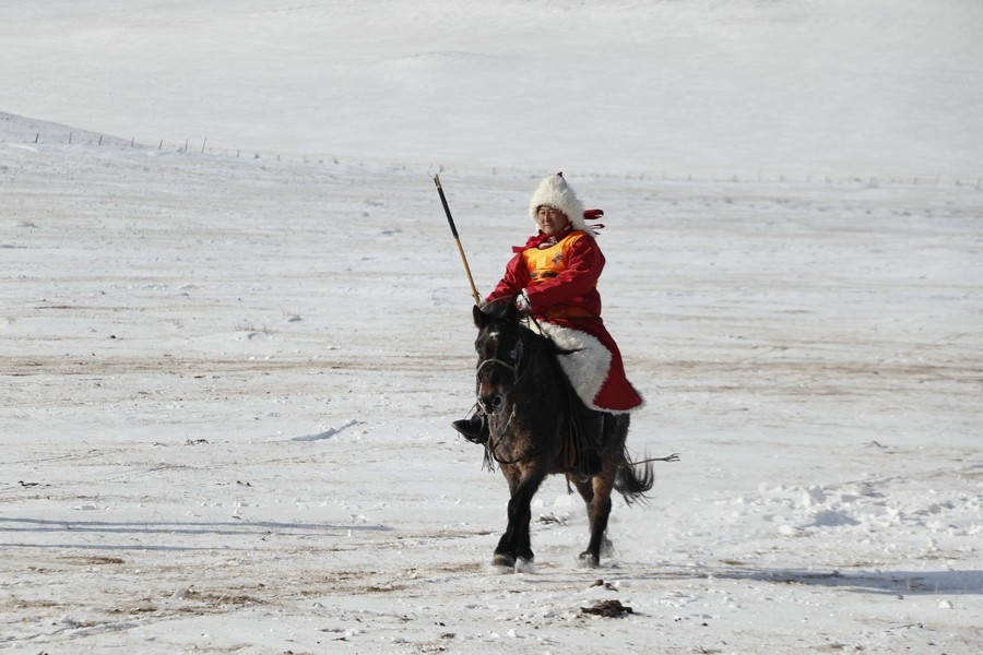 隨著裁判一聲令下,馬匹奮蹄疾行,冬日草原也被這激情瞬間引燃。騎手們也盡顯高超的騎術(shù),不甘落后、彼此反超,高潮迭起。