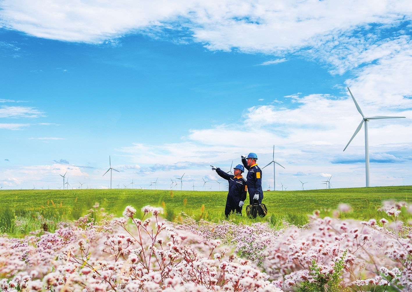 近日,國華投資蒙東分公司輝騰梁風電場內(nèi),風機群與遍野花海相映成趣,兩名風電運維工程師,正在交流剛處理完的偏航故障細節(jié),核對風速儀、風向標校準數(shù)據(jù),討論后續(xù)防沙維護措施,同時檢查設備運行狀態(tài),確保風機穩(wěn)定發(fā)電。