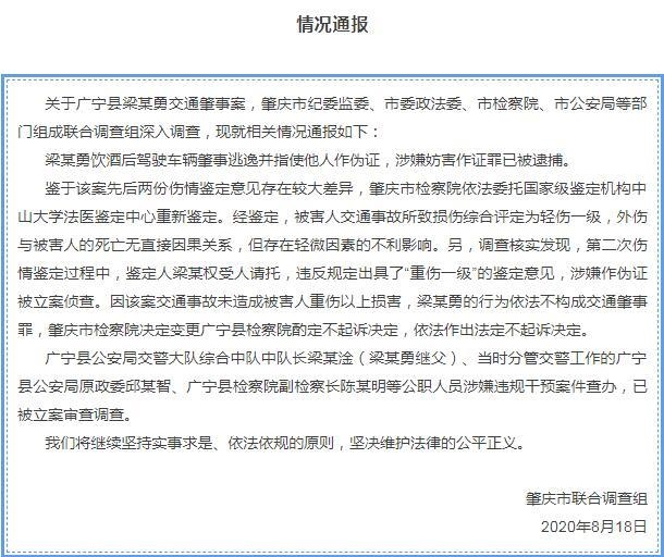 據(jù)肇慶市官方發(fā)布公眾號“肇慶發(fā)布”消息,關于廣寧縣梁某勇交通肇事案,肇慶市紀委監(jiān)委、市委政法委、市檢察院、市公安局等部門組成聯(lián)合調查組深入調查,通報相關情況:梁某勇飲酒后駕駛車輛肇事逃逸并指使他人作偽證,涉嫌妨害作證罪已被逮捕。