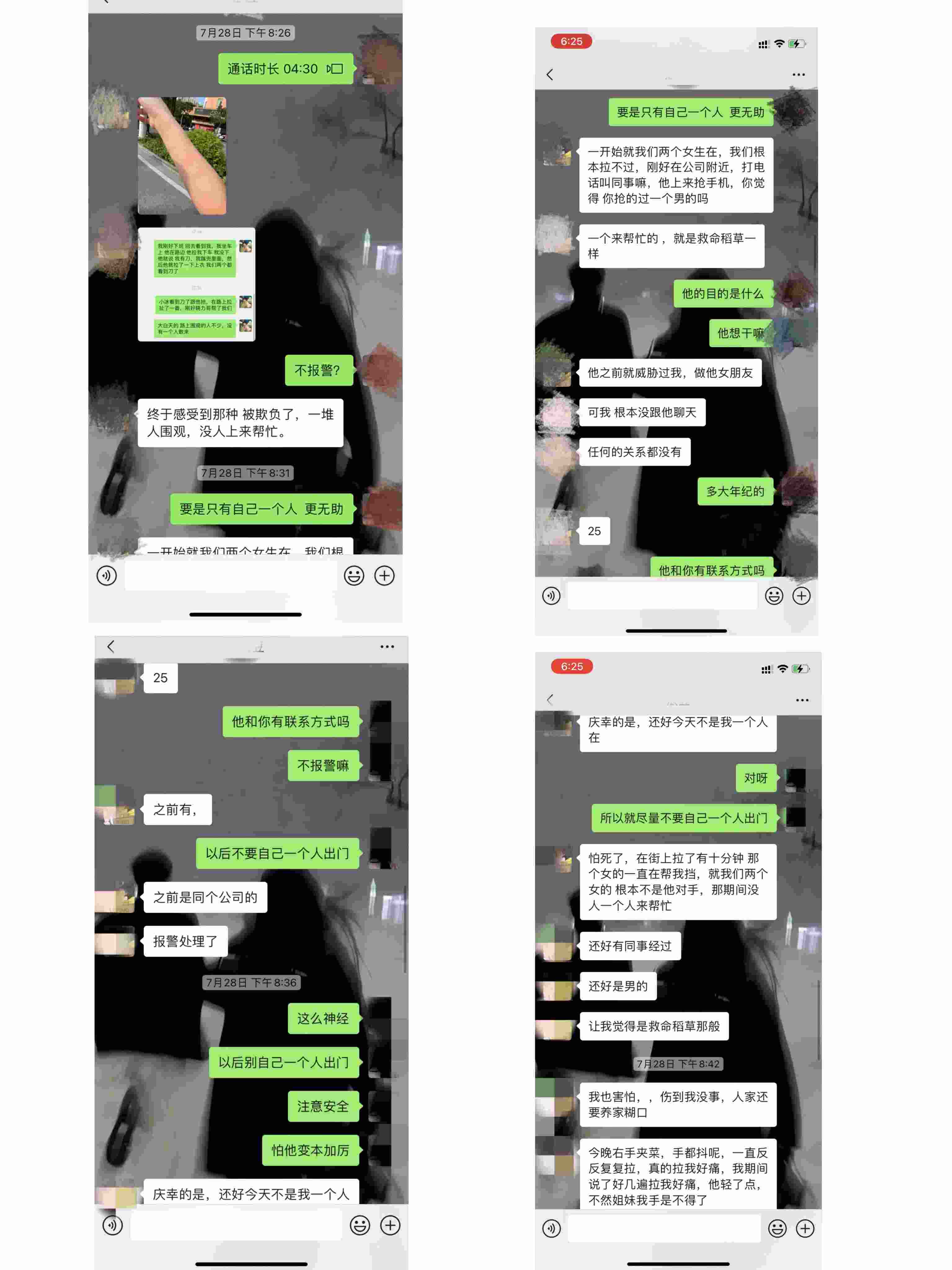 相關(guān)聊天截圖顯示,此次被黃某南威脅后,陳某萍和朋友在微信聊天時(shí)表示,“報(bào)警處理了”。陳某萍還表示,當(dāng)時(shí),黃某南拉她上衣時(shí),她看到了刀,感到非常害怕,幸好有同事出手相助。“他之前就威脅過我,做他女朋友??晌腋緵]跟他聊天,任何關(guān)系都沒有?!?/p>