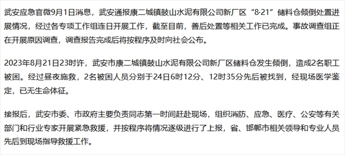 ·河北武安:一水泥廠儲料倉發(fā)生傾倒致兩人死亡。