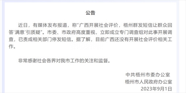 ·網傳廣西開展社會評價,梧州群發(fā)短信讓群眾回答“滿意”,梧州市政府:開展調查,已責成相關部門停發(fā)短信。據(jù)了解廣西還未開展社會評價相關工作。