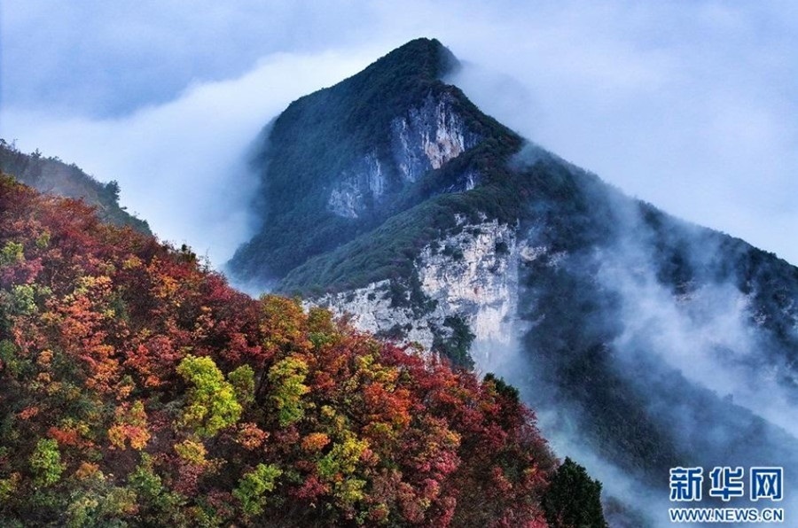 云霧繚繞,半山紅葉與半山青黛交相輝映。深秋時節(jié),三峽地區(qū)霜染秋葉,與青山綠水相映成趣。