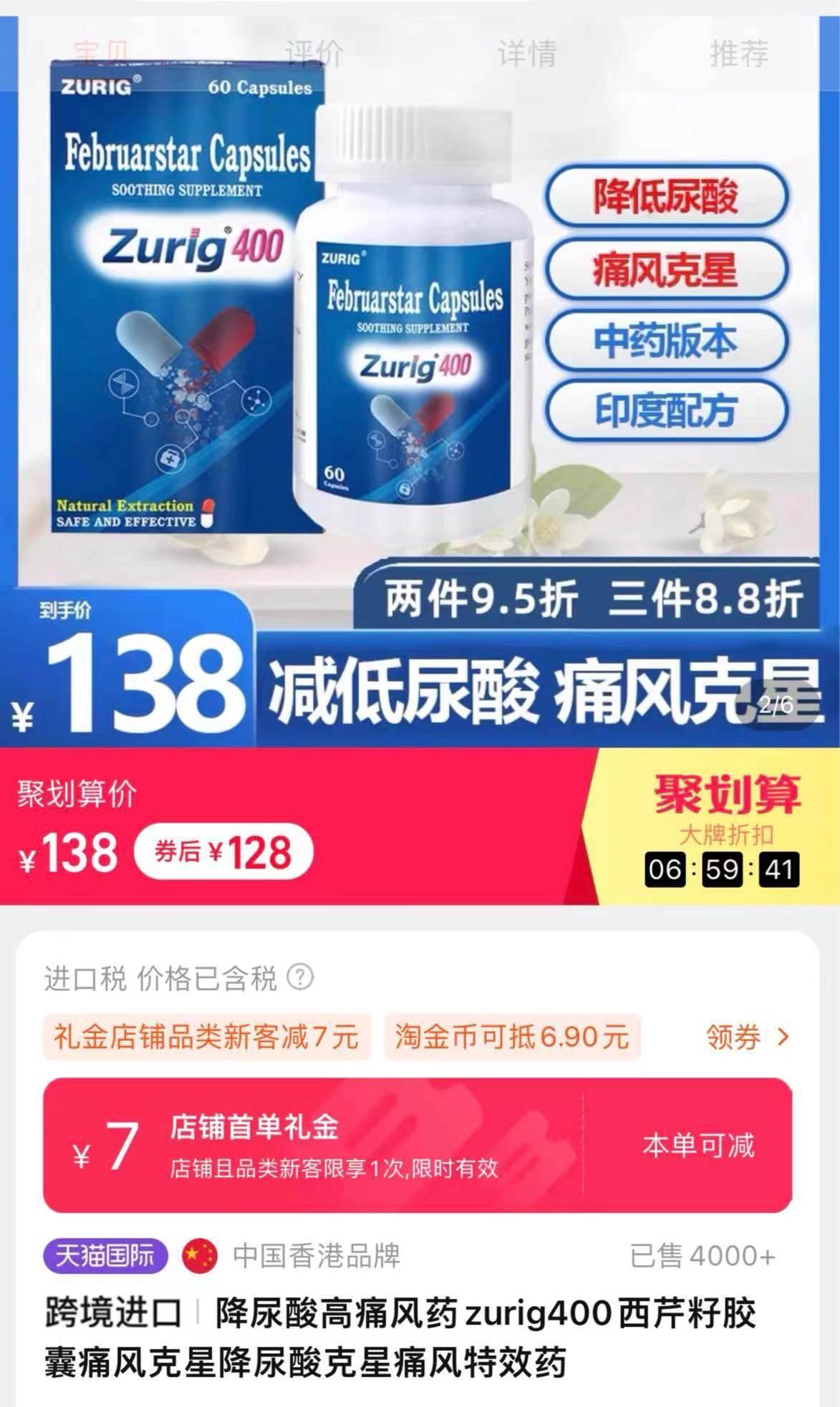 此外,zurig400在銷售頁面還模仿印度zurig80,宣稱降尿酸、痛風(fēng)藥。澎湃新聞?dòng)浾哒{(diào)查發(fā)現(xiàn),zurig400目前在多個(gè)網(wǎng)購平臺(tái)有售,有商家顯示已出售4000+。 經(jīng)了解后得知,印度zurig80實(shí)際上是一款仿制藥,目前國內(nèi)并未獲批上市;而zurig400卻是一款香港產(chǎn)的保健品類目產(chǎn)品,并非藥品。但產(chǎn)品宣傳時(shí)卻使用“痛風(fēng)特效藥”“印度配方”“中藥非布”等詞語,讓患者產(chǎn)生誤會(huì)。