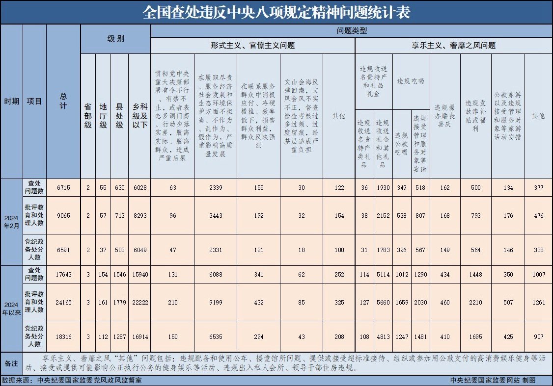 央視網(wǎng)消息:3月26日,中央紀(jì)委國(guó)家監(jiān)委公布了2024年2月全國(guó)查處違反中央八項(xiàng)規(guī)定精神問(wèn)題匯總情況。當(dāng)月,全國(guó)共查處違反中央八項(xiàng)規(guī)定精神問(wèn)題6715起,批評(píng)教育和處理9065人,其中黨紀(jì)政務(wù)處分6591人,這是連續(xù)第126個(gè)月公布月報(bào)數(shù)據(jù)。