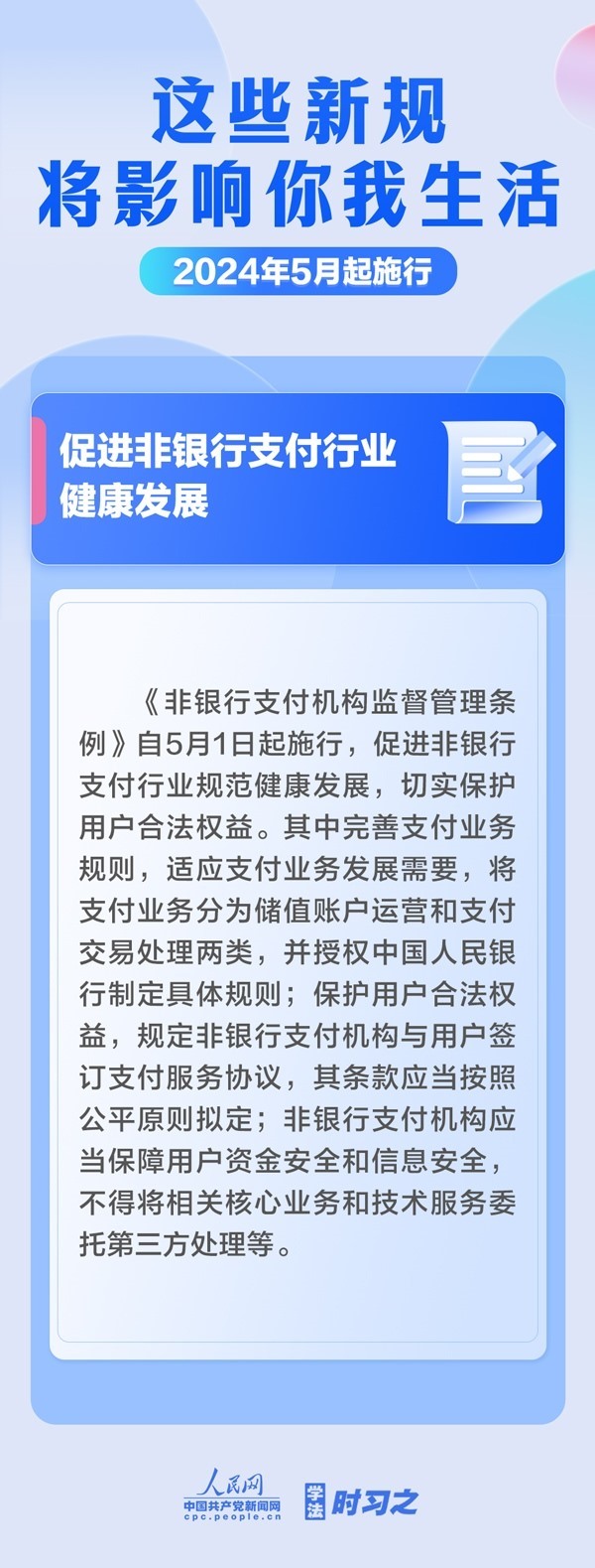 促進非銀行支付行業(yè)健康發(fā)展;首次對社會組織名稱進行統(tǒng)一規(guī)定;破除資格預審等招投標領域交易壁壘……5月起,這些新規(guī)施行,將影響你我生活。