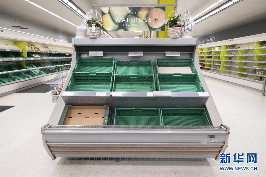 這是3月21日在英國倫敦拍攝的一家超市內(nèi)空空的貨架。新華社記者韓巖攝