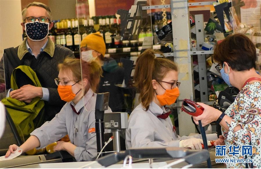 這是4月6日在德國耶拿一家超市拍攝的戴著口罩的收銀員和顧客。新華社發(fā)(凱文·福格特攝)
