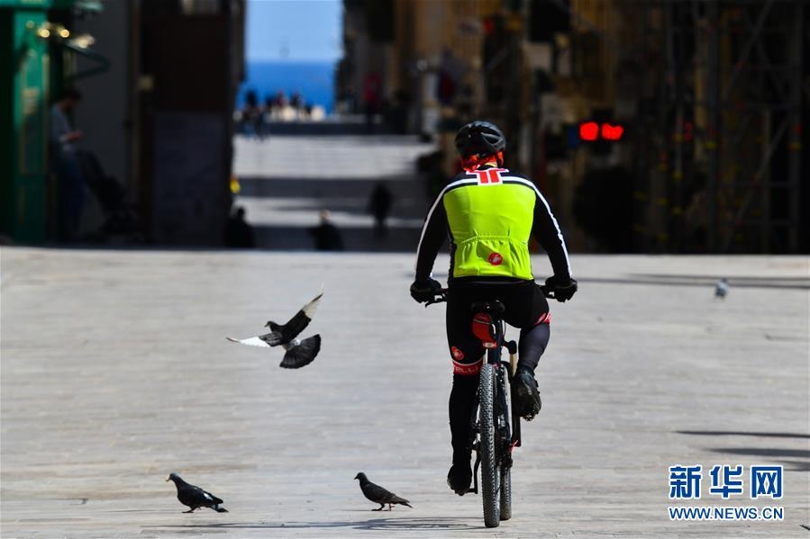 這是3月29日,在馬耳他首都瓦萊塔,行人在空曠的街道上騎行。新華社發(fā)(喬納森·博爾格攝)