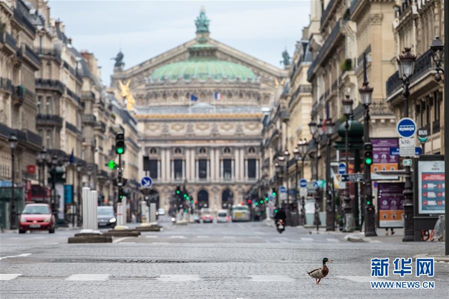 這是4月6日,在法國巴黎,一只鴨子在巴黎歌劇院前的大道上“溜達”?!敖懔睢睂嵤┢陂g,不少動物“溜達”到巴黎空蕩無人的大街上。新華社發(fā)(奧雷利安·莫里薩爾攝)