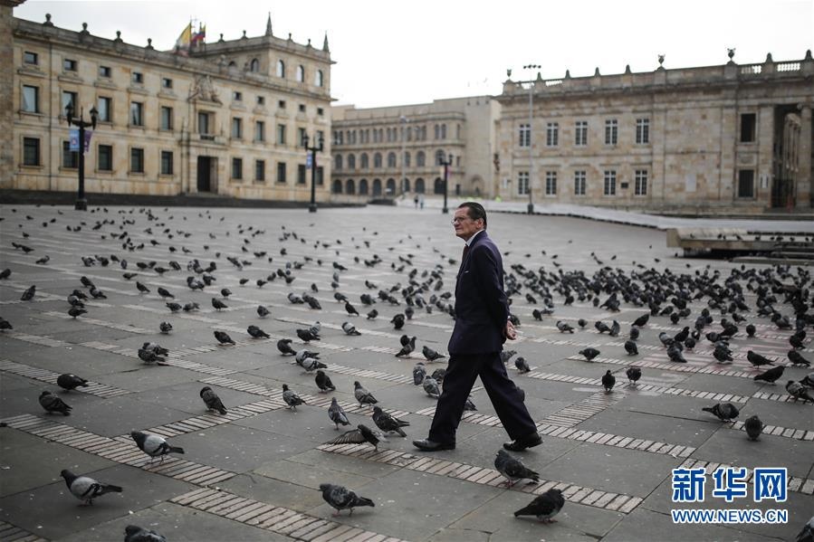 這是3月20日,在哥倫比亞波哥大,一名男子走在平時熙熙攘攘的玻利瓦爾廣場。新華社發(fā)(約翰·帕斯攝)