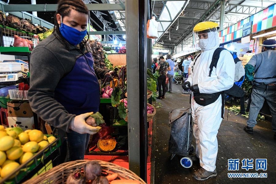 這是4月16日,身穿防護服的顧客在智利圣地亞哥拉貝加中心市場采購。新華社發(fā)(豪爾赫·比列加斯攝)