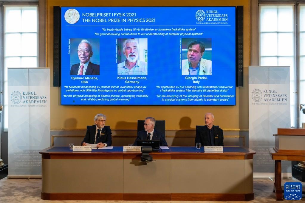 10月5日,在瑞典斯德哥爾摩舉行的2021年諾貝爾物理學(xué)獎(jiǎng)公布現(xiàn)場(chǎng),屏幕上顯示獎(jiǎng)項(xiàng)得主真鍋淑郎(左)、克勞斯·哈塞爾曼(中)和喬治·帕里西的照片。(新華社發(fā),魏學(xué)超攝)
