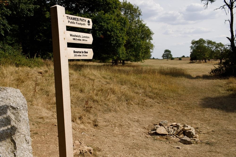 ↑這是8月14日在英國賽倫塞斯特附近拍攝的干涸的泰晤士河發(fā)源地和一塊寫有“泰晤士河起點”的石碑。