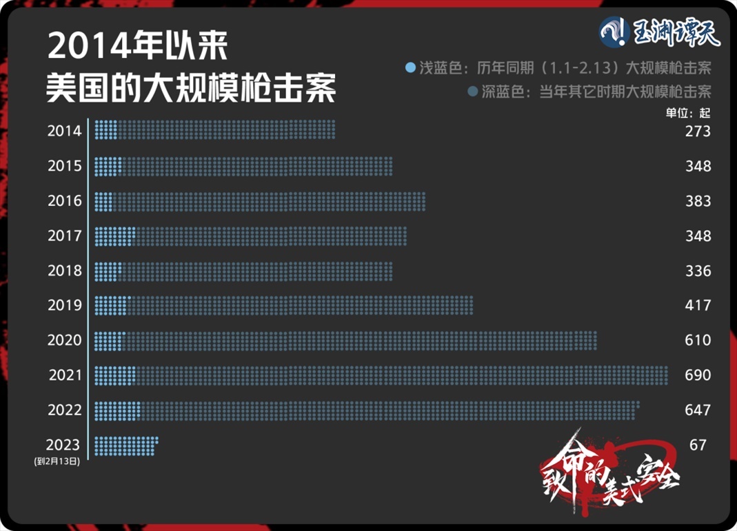 2023年開年到現(xiàn)在,美國(guó)的大規(guī)模槍擊案數(shù)量創(chuàng)下歷史同期新高。到2月13日,美國(guó)已經(jīng)發(fā)生了67起大型槍擊案,也就是說,現(xiàn)在的美國(guó),平均每天至少要發(fā)生一起大規(guī)模槍擊案。在此期間,F(xiàn)BI飽受詬病,甚至被稱為美國(guó)槍擊案的間接推手。