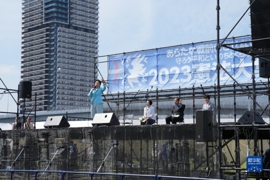 5月3日,在日本東京有明防災(zāi)公園的廣場(chǎng)上,在野黨社民黨黨首福島瑞穗在集會(huì)上發(fā)表演講。新華社記者 張笑宇 攝