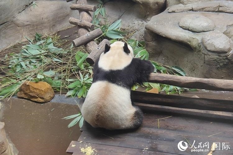 記者趕到時,離開爸爸媽媽單獨生活的“圓夢”正躺在木床上呼呼大睡,四仰八叉的可愛模樣吸引游客們紛紛駐足,拍照留念。動物園工作人員介紹說,“圓夢”現(xiàn)在已經(jīng)五歲多了,體重超過100公斤,身高也同成年大熊貓無差,活潑好動、元氣滿滿。隨著飼養(yǎng)員往園內(nèi)投入新鮮的竹子,“圓夢”也慢慢醒過來,開始享用竹子大餐?!拔铱梢砸徽煸谶@里看它吃飯!真的太可愛了!這是我在動物園最喜歡的動物!”今年8歲的梅麗莎興奮地說。