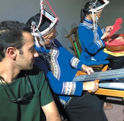發(fā)展,是新疆留給納瓦爾的第一印象?!拔覀冏哌M(jìn)了烏魯木齊這座中國西部的現(xiàn)代化城市,感受到了當(dāng)?shù)孛癖姲簿訕窐I(yè)的生活?!痹谛陆畤H大巴扎,種類繁多的干果、色彩斑斕的艾德萊斯綢等特色產(chǎn)品讓人目不暇接?!拔矣龅搅艘晃皇炙嚲康牡靥簬煾?,他編織過程中的每一個手勢都充滿了韻律感。我陶醉于他的手藝,也被地毯精美且極具傳統(tǒng)特色的紋樣設(shè)計所吸引。我向他請教,他也熱情回答。我后來把這些美好的記憶都融入了作品當(dāng)中。”納瓦爾說。
