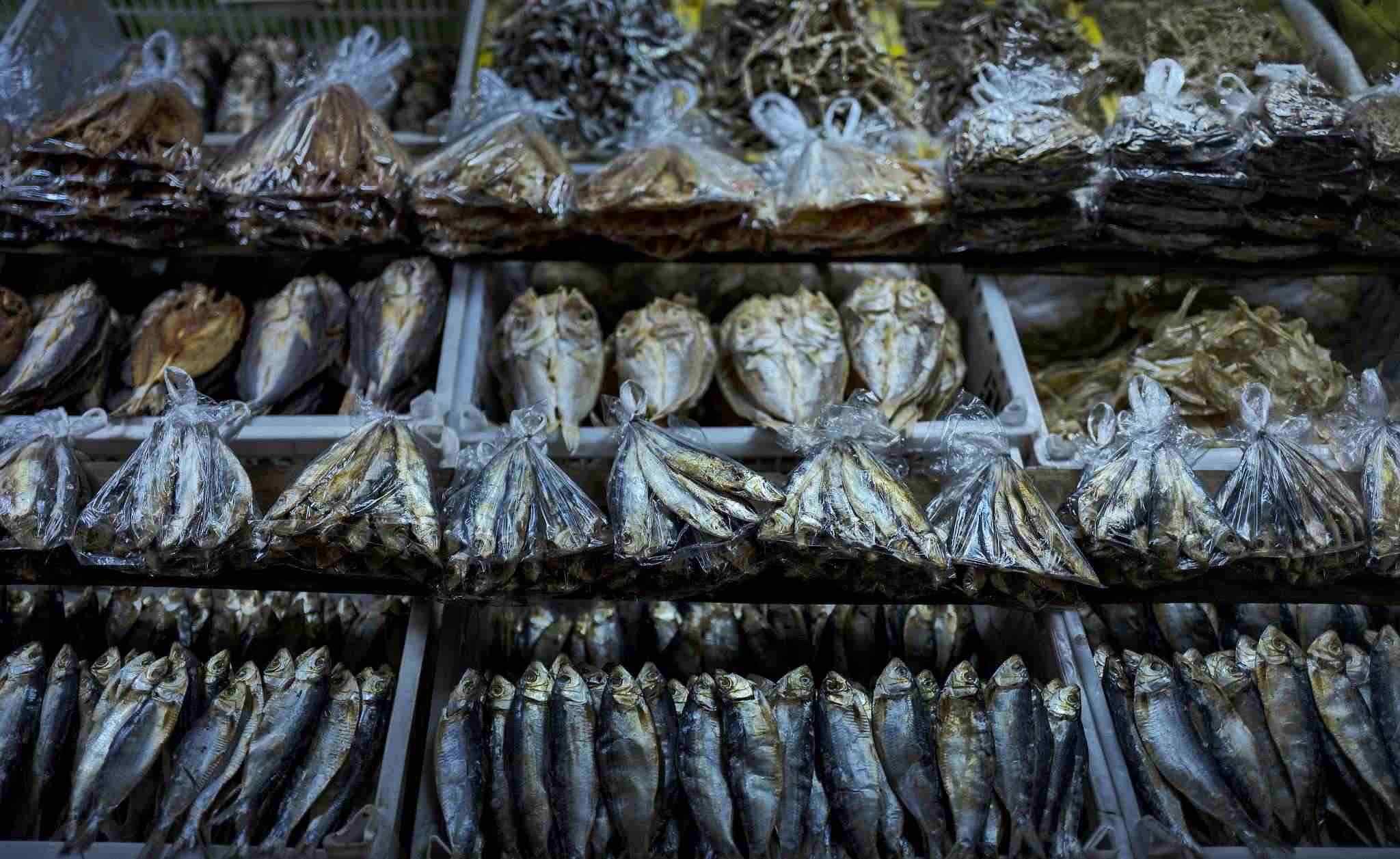 當(dāng)?shù)貢r(shí)間2023年4月19日,菲律賓馬尼拉菜市場(chǎng)上,用塑料袋包裹著的魚干。