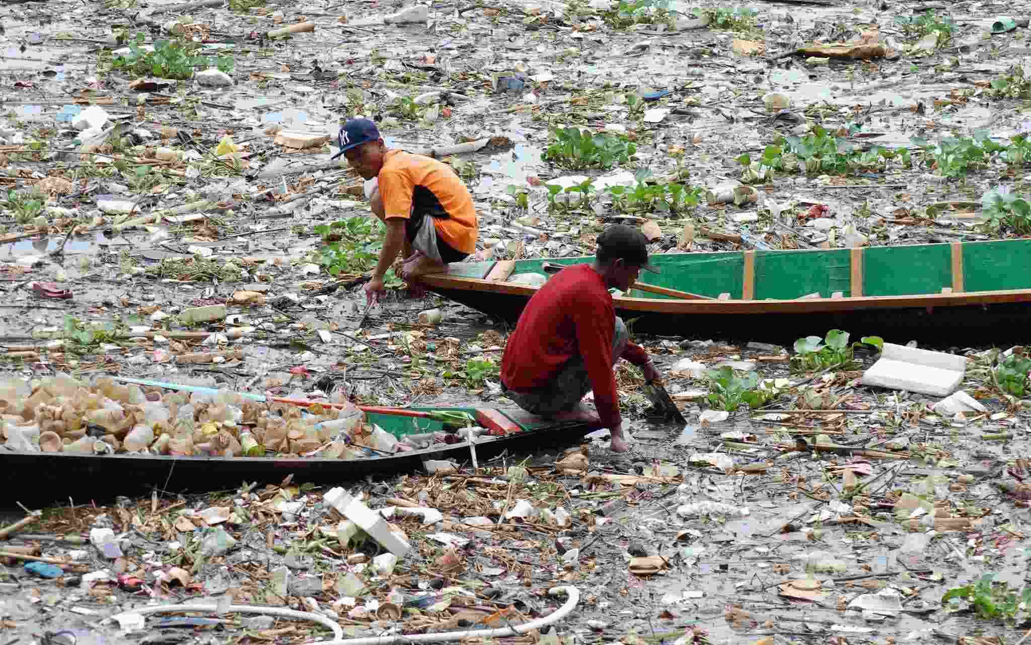 當(dāng)?shù)貢r(shí)間2023年3月28日,印度尼西亞萬隆,兩名工人在芝塔龍河道中收集塑料。