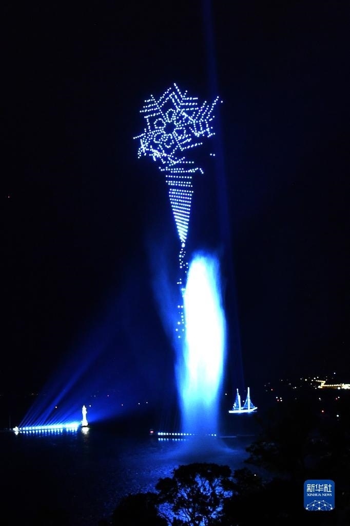 當(dāng)晚,無人機光影音樂秀在瑞士日內(nèi)瓦湖上舉行,超過1350架無人機點亮夜空,吸引市民駐足觀看。新華社記者 連漪 攝