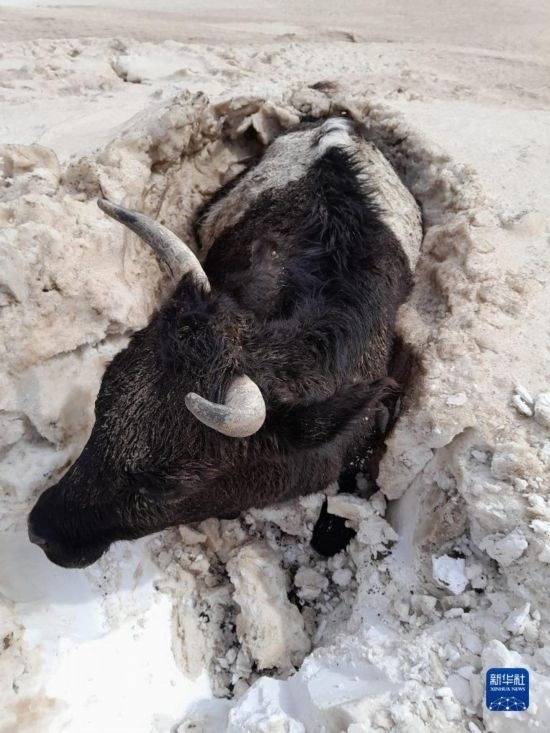 5月20日,在蒙古國蘇赫巴托爾省,一頭牛被埋在雪堆中。新華社發(fā)(蒙古國蘇赫巴托爾省BBS電視臺供圖)