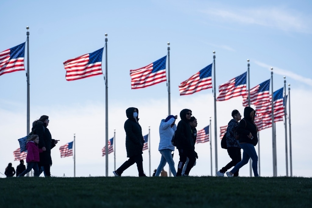 這是2022年3月29日,行人走在美國(guó)首都華盛頓的國(guó)家廣場(chǎng)。新華社記者劉杰攝