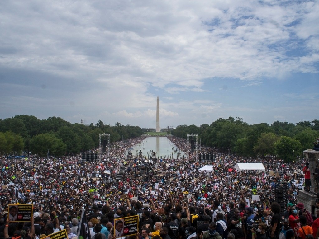 2020年8月28日,人們?cè)诿绹?guó)首都華盛頓林肯紀(jì)念堂附近參加反種族歧視和暴力執(zhí)法示威活動(dòng)。新華社發(fā)(阿蘭攝)