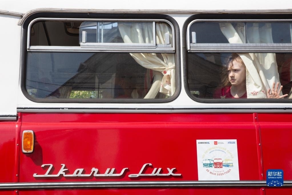 5月20日,小朋友在俄羅斯圣彼得堡參觀街頭老爺車展。