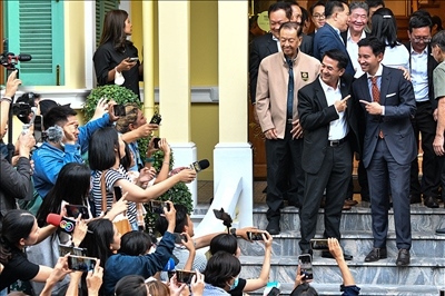 當地時間2023年5月17日,泰國曼谷,泰國遠進黨黨魁皮塔與泰國為泰黨黨魁春拉南在與聯盟伙伴舉行會議后合影。
