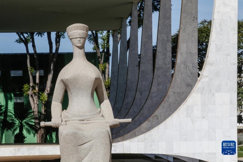 這是5月22日在巴西首都巴西利亞三權(quán)廣場(chǎng)聯(lián)邦最高法院前拍攝的一尊雕像。
