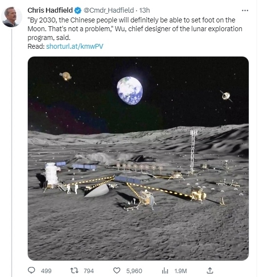 據(jù)報(bào)道,加拿大航天局前宇航員克里斯·哈德菲爾德在社交媒體推特上轉(zhuǎn)發(fā)了CGTN的一篇報(bào)道,他同時(shí)寫道,“中國(guó)探月工程總設(shè)計(jì)師吳偉仁說(shuō),‘到2030年,中國(guó)人的足跡一定能夠踏上月球。這不是個(gè)問題?!?/p>