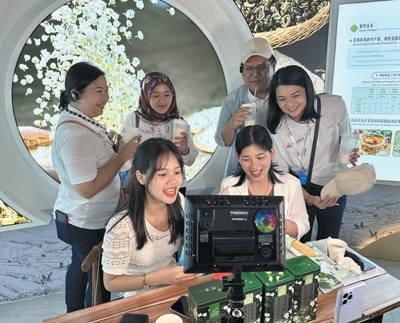 廣西橫州市茉莉花展館內(nèi),工作人員在直播展示茉莉花特色產(chǎn)品,東盟青年加入其中并向網(wǎng)友們問好。本報(bào)記者 戴楷然攝