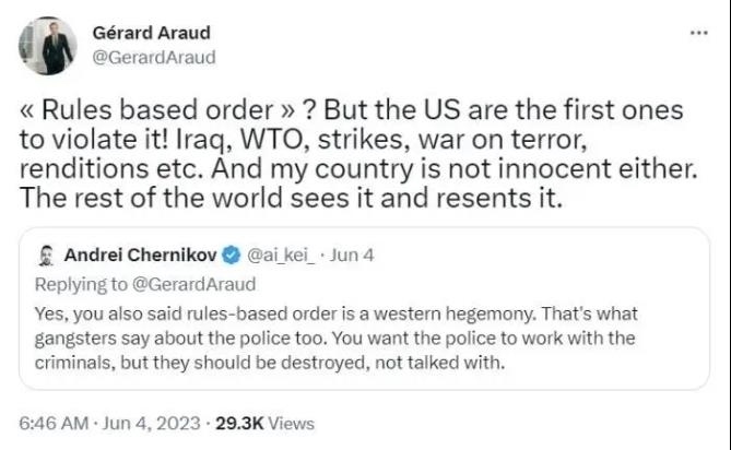 在另一條推文中,阿羅指出,從美國(guó)在伊拉克戰(zhàn)爭(zhēng)、世貿(mào)組織違規(guī)、所謂“反恐戰(zhàn)爭(zhēng)”中的表現(xiàn)可見,是美國(guó)首先違反了“基于規(guī)則的秩序”。世界上其他國(guó)家看到了這一點(diǎn),對(duì)此感到憤慨。