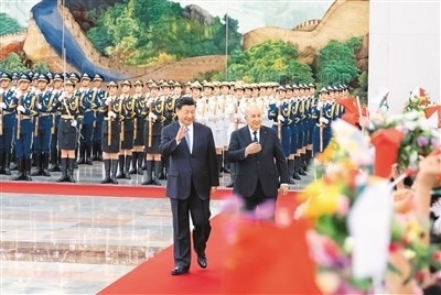 | 七月十八日下午,國(guó)家主席習(xí)近平在北京人民大會(huì)堂同來(lái)華進(jìn)行國(guó)事訪問的阿爾及利亞總統(tǒng)特本舉行會(huì)談。這是會(huì)談前,習(xí)近平在人民大會(huì)堂北大廳為特本舉行歡迎儀式。新華社記者 翟健嵐攝 |