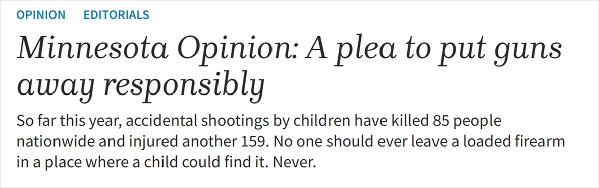 美國KSDK新聞網(wǎng)站報(bào)道稱,根據(jù)美國疾病控制與預(yù)防中心(CDC)的數(shù)據(jù),槍支暴力是導(dǎo)致美國兒童死亡的主要原因,而槍擊很多時(shí)候發(fā)生在家里。美國《圣迭戈時(shí)報(bào)》(Times of San Diego)網(wǎng)站的報(bào)道也指出,美國大多數(shù)涉及兒童的意外槍擊死亡都是未被鎖起來保存的已上膛槍支造成的。