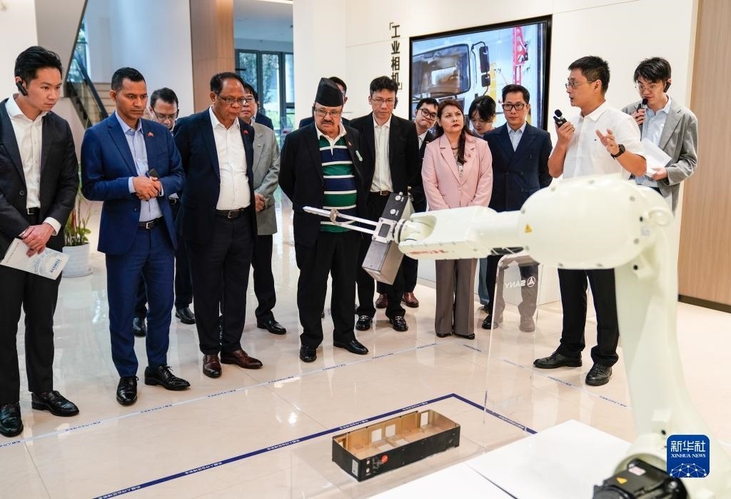 8月30日,在浙江省桐鄉(xiāng)經(jīng)濟(jì)開發(fā)區(qū),駐華使節(jié)參觀盛景智能科技(嘉興)有限公司。新華社記者 韓傳號(hào) 攝