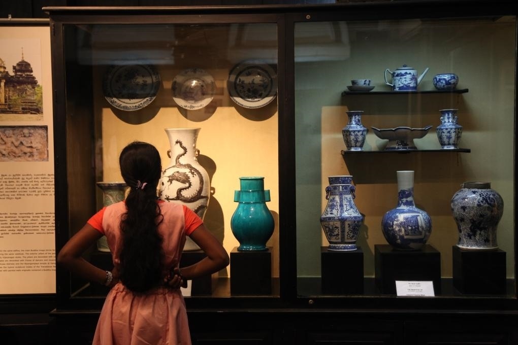 2014年9月15日,在斯里蘭卡首都科倫坡,游客參觀斯里蘭卡國家博物館展出的當?shù)爻鐾恋闹袊糯善?,一些中國外銷瓷器上還繪有南亞、伊斯蘭風(fēng)情,與鄭和碑共同見證著古代海上絲綢之路和中斯友好交往的源遠流長。 新華社記者馮武勇攝