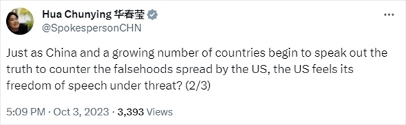 美國(guó)國(guó)務(wù)院上月28日炮制虛假報(bào)告,謊稱(chēng)中國(guó)正斥資數(shù)十億美元在全球散布虛假信息。我外交部發(fā)言人華春瑩3日在X平臺(tái)對(duì)美方的謬論予以了駁斥。